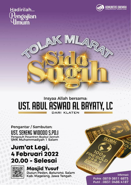 Hadirilah Pengajian Umum Tolak Mlarat Sido Sugih bersama Ustadz Abul Aswad Al-Bayaty Hafidzahulloh di Masjid Yusuf Peden, Baturono, Salam, Magelang